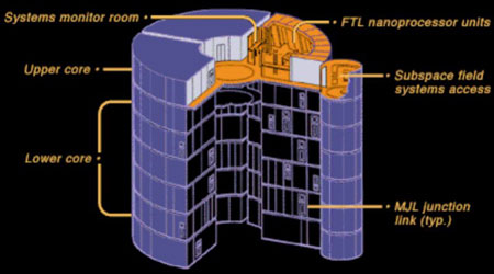 Standard Federation computer system design includes three fully redundant computer cores on board most Starfleet starships. These cores are cylindrical in shape and may be as large as ten decks depending on the size of the starship. Two main computer cores are normally placed in the primary hull that are 100% redundant, if either core fails the other core can assume the full load of computer processing with no interruption. A third core normally placed in the stardrive hull that serves as a back up to the first two cores and controls the stardrive section when separated from the primary hull. In the event of a failure of any of the cores, each core it able to control all primary systems onboard the starship.