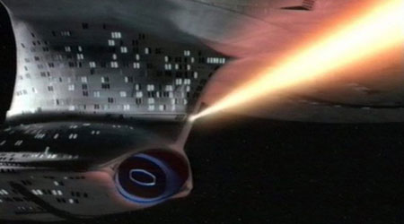 Starfleet uses a common phaser array layout for most of its starships. There are two primary large dorsal and ventral arrays wrapped around the saucer section. There may also be numerous smaller phaser arrays on the stardrive section and nacelles. This configuration gives a starship a near 360 degree firing arc in all directions. Most Starfleet ships are equipped with type X phasers which have a maximum power output of 5.1 MW per emitter segment and an effective range of 300,000 kilometers. Phaser recharge time is less the 0.5 seconds with a sustained full power fire time of 45 minutes. New Starfleet ships are now equipped with type XII phasers; performance specifications of these weapons are classified. Older vessels still in service may be equipped with type VII-IX phasers with significantly downgraded specs.